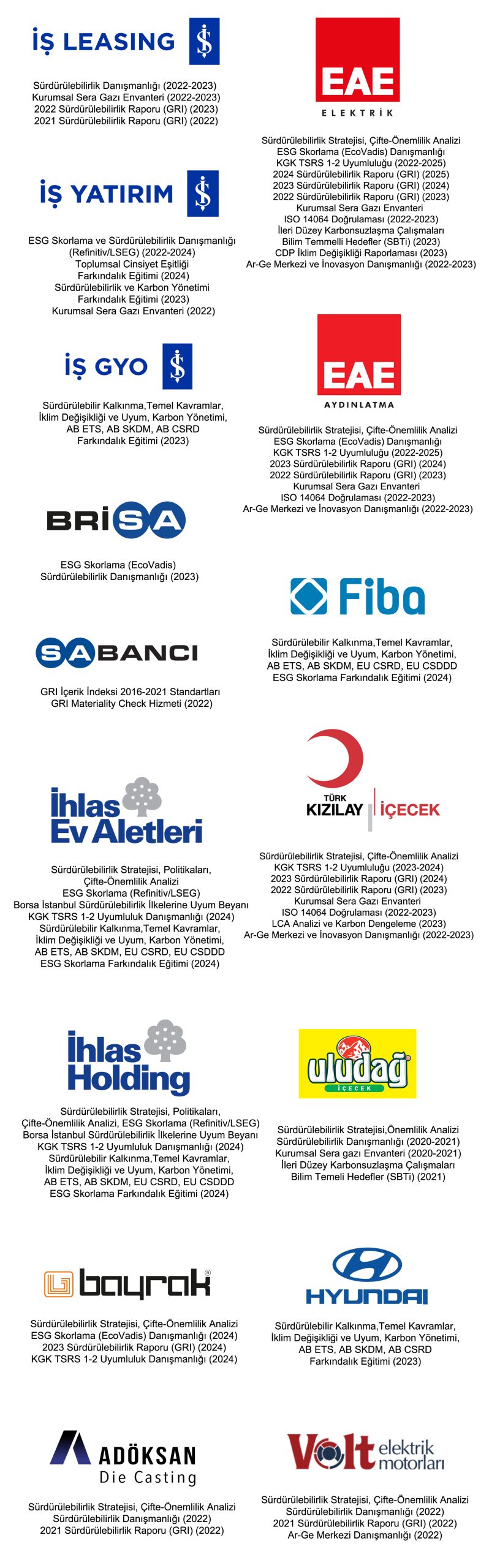 - Kurumsal Sürdürülebilirlik Stratejisi‘nin Geliştirilmesi (Sektör Spesifik Önceliklendirme, SDGs Hizalaması ve Çifte Önemlilik Analizi, Değer Zinciri Tanımlamaları